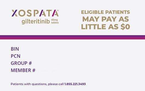 This offer is not health insurance and is only valid for patients in the 50 United States, Washington DC, Puerto Rico, Guam and Virgin Islands. This offer is not valid for cash paying patients. This Program is void where prohibited by law. No membership fees. It is illegal to sell, purchase, trade, counterfeit, duplicate, or reproduce, or offer to sell, purchase, trade, counterfeit, duplicate or reproduce the card. This offer will be accepted only at participating pharmacies. Certain rules and restrictions apply. Astellas reserves the right to revoke, rescind, or amend this offer without notice. The Program has a maximum copay assistance limit of $7,000 per calendar year. After the annual maximum on copay assistance is reached, patient will be responsible for the remaining out-of-pocket costs for XOSPATA. Astellas may reduce or discontinue the copay assistance available under the Program if it determines an enrolled patient is subject to a program offered by a third-party payer or pharmacy benefit manager, or an agent of either, that adjusts patients’ out-of-pocket cost-sharing obligations based on the copay assistance provided by this Program, or excludes the copay assistance provided under this Program from counting towards an enrolled patient’s out-of-pocket cost-sharing obligations (“maximizer” or “accumulator” program). The Program uses advanced logic to identify whether a claim for an enrolled patient is subject to a “maximizer” or “accumulator” program. Unless prohibited by law, Astellas may reduce the cost-sharing assistance available under the Program to a per claim maximum of $25 if it determines a claim for an enrolled patient is subject to a “maximizer” or “accumulator” program.